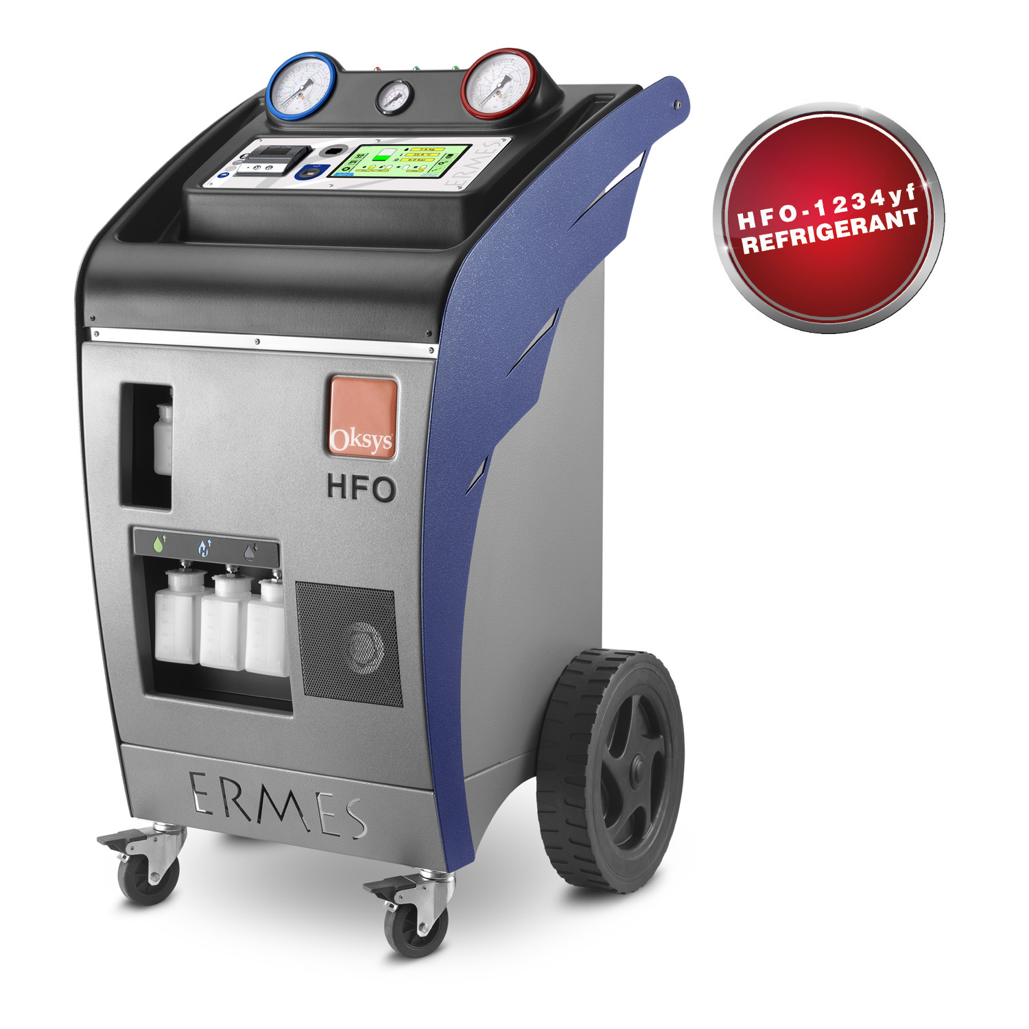 Oksys polnilna postaja za polnjenje klim v vozilih ERMES HFO je opremljena z uporabnikom prijazno kontrolno enoto katera za svoje delovanje uporablja zaslon na dotik, ki nam omogoča preprosto in učinkovito delo.