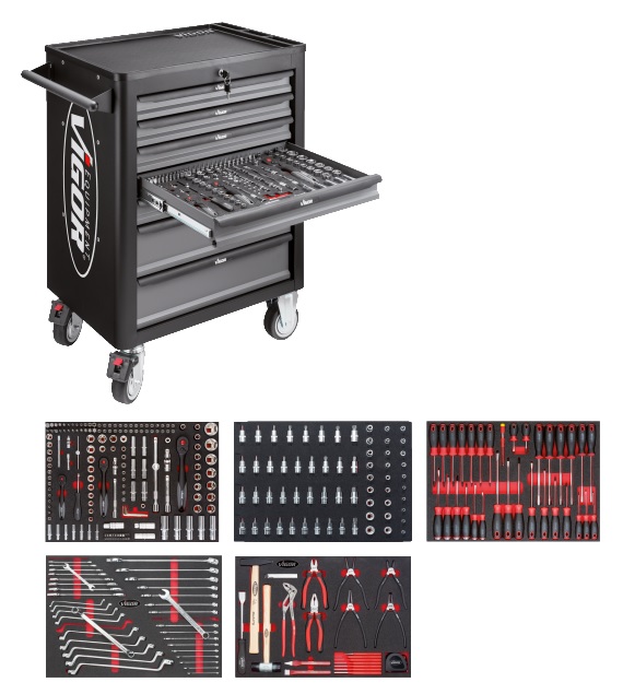 Vigor voziček orodja je opremljen s petimi plitvimi predali (tudi opremljeni z orodjem) in dvema globokima (prazni).